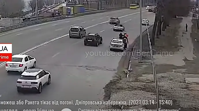 Это видео быстро распространилось в социальных сетях. На нем видно, что мужчина проехал на красный свет, отбивается от патрульных и в результате уходит от преследователей безнаказанным.