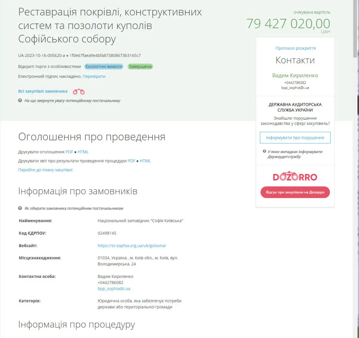 Национальный заповедник «София Киевская» отреставрирует кровли, конструктивные системы и позолоту куполов Софийского собора за почти 80 млн грн. Об этом говорится на сайте публичных закупок Prozorro.