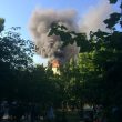 По информации очевидцев, часть кровли здания пожарные уже смогли потушить, другая сторона пока догорает.