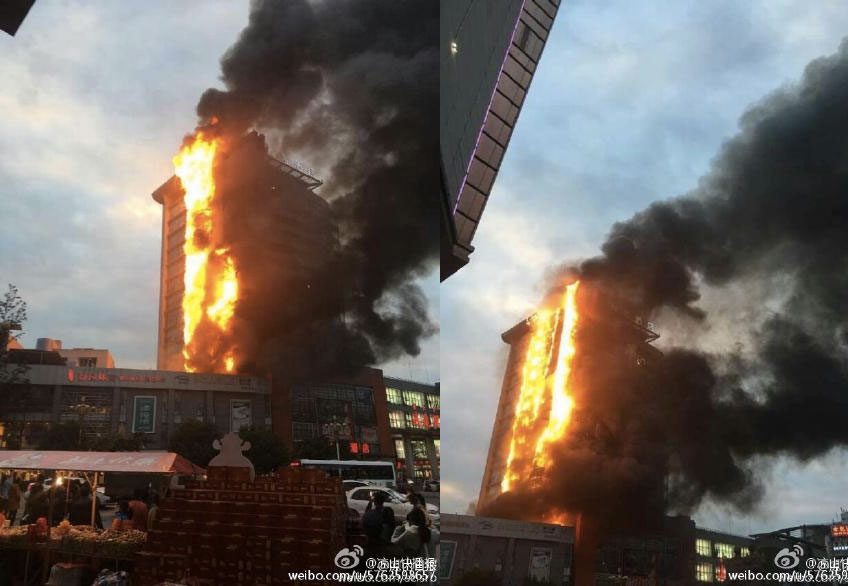 В городе Сичан провинции Сычуань в Китае случился пожар в здании многоэтажного отеля. По данным CCTV, огонь охватил все этажи, но сколько их, не уточняется.