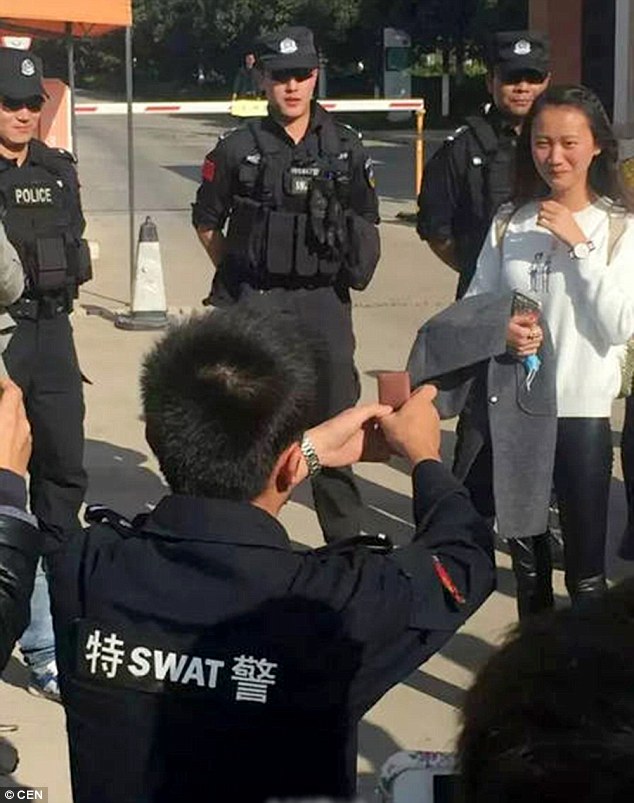 Зайдя на территорию кампуса в колледже Юньнань, один из полицейских опустился на колено и сделал предложение. Вся его команда стояла вокруг него и с чрезвычайно серьезным взглядом наблюдала, как он предлагал девушке руку и сердце.