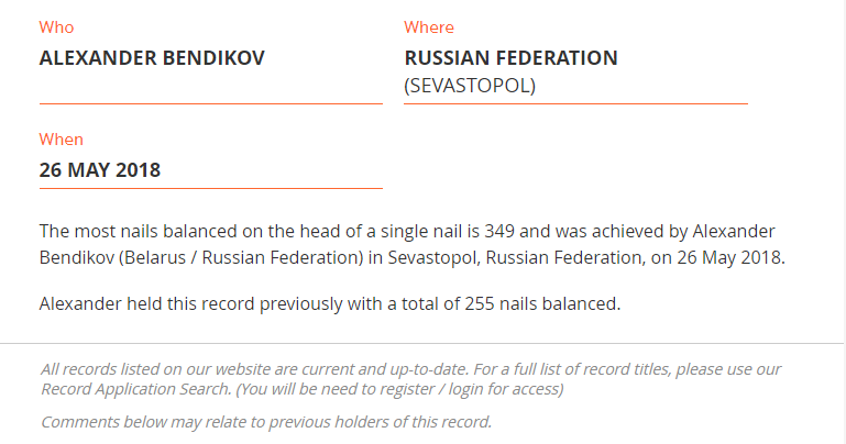 Сообщается, что «Александр Бендиков (Беларусь / Россия) установил в Севастополе, РФ, мировой рекорд по балансированию предметов. Он удержал на одном гвозде еще 349 гвоздей».