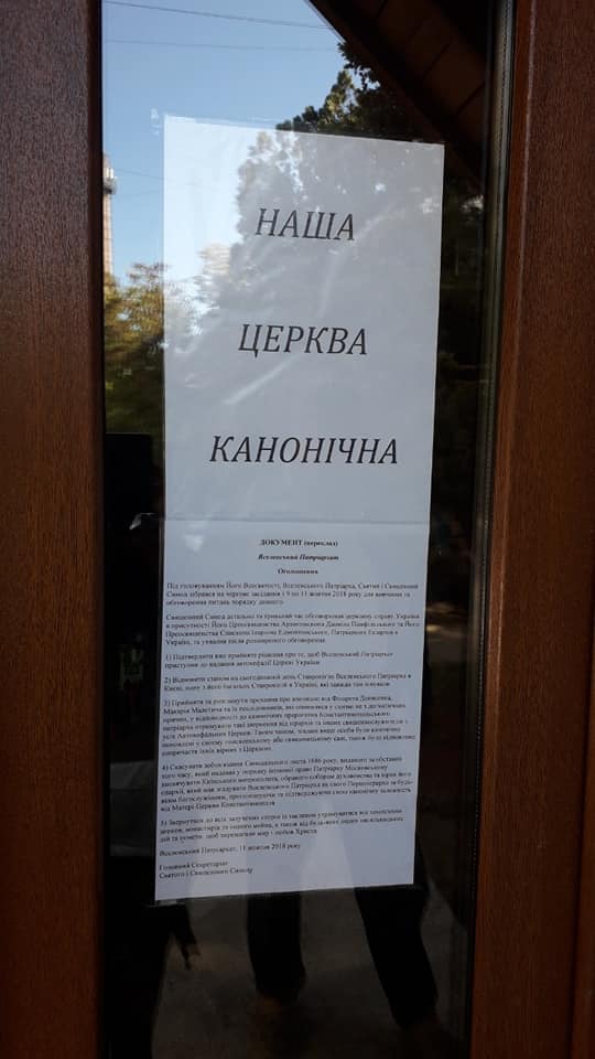 На фото видно, что на двери церкви прикреплен лист с надписью «Наша церковь канонична», выполненной большими буквами.