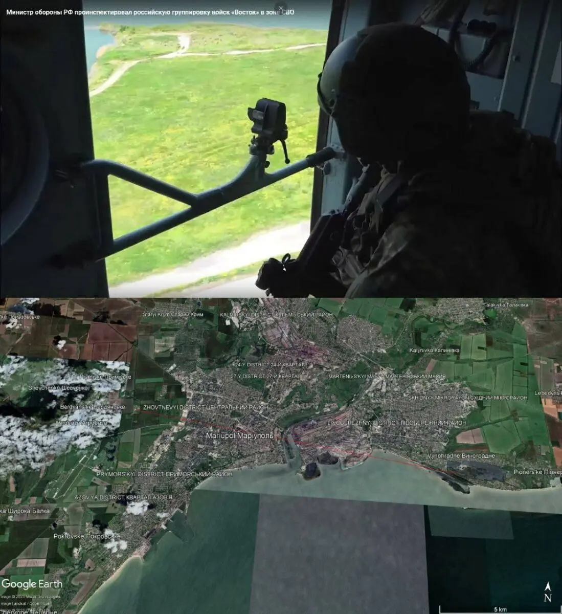 «На новых спутниковых снимках виден ущерб от удара по подконтрольному России Мариуполю. Этот участок находится более чем в 70 км от линии фронта в Украине», — пишет OSINT-аналитик Брейди Африк.
