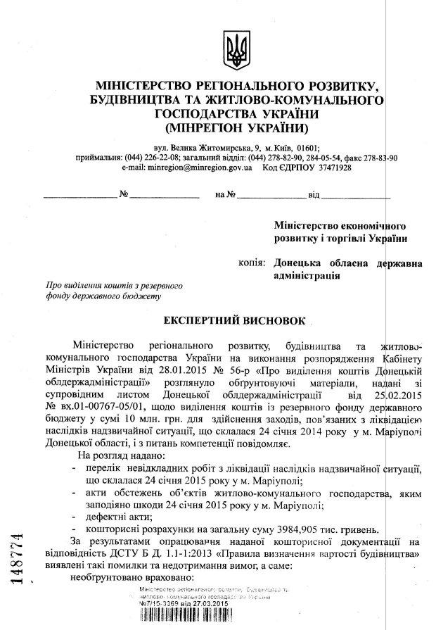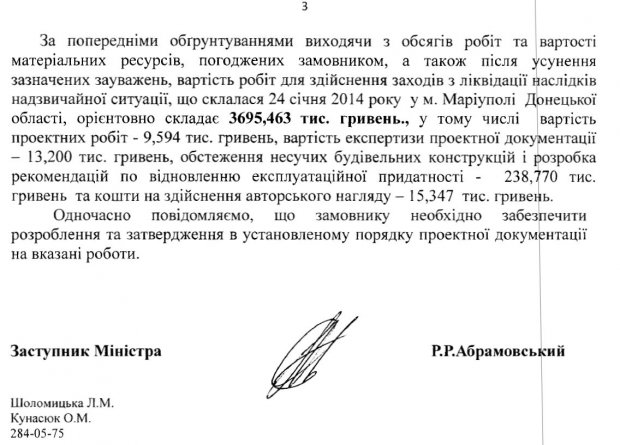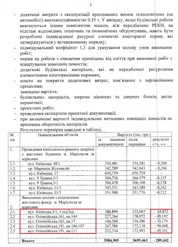 Кроме того, согласно экспертному заключению Министерства регионального развития, сумму, необходимую на ремонтные работы, мариупольская власть превысила, а именно — указала лишние 289 тыс.443 гривны. Экспертиза министерства выявила завышение цен на строительные материалы, стоимость проектных работ, экспертиз и другие нарушения.