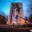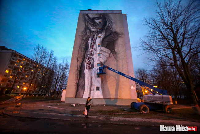 В Минске на стене 9-этажного общежития появилось граффити британско-австралийского уличного художника Гвидо ван Хельтена с изображением белорусской девушки в вышиванке, во многом похожее на мурал, нарисованный на одном из киевских домом.