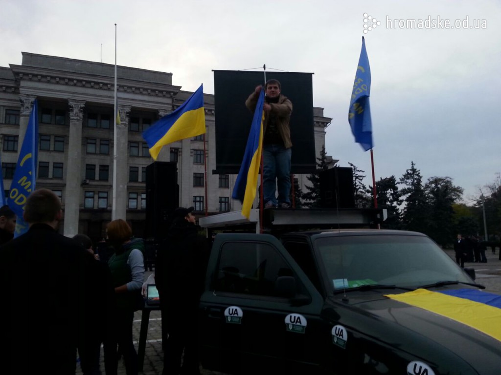 Активисты «Автомайдана» разместили напротив Дома профсоюзов импровизированную сцену с экраном, на котором показывают фильм о действиях Антимайдана в Одессе.