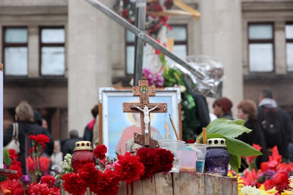 В это же время траурный митинг проходит на Соборной площади, там собралось около 300 человек. Они поминают погибших 2 мая активистов Евромайдана, проходит молебен.
