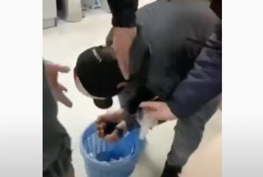На кадрах видно, как мужчину заставляют присесть возле ведра. После один из охранников налил ему в руки зеленку, а другой сотрудник охранной фирмы силой заставил его умыться. Также охранник ударил мужчину в живот.