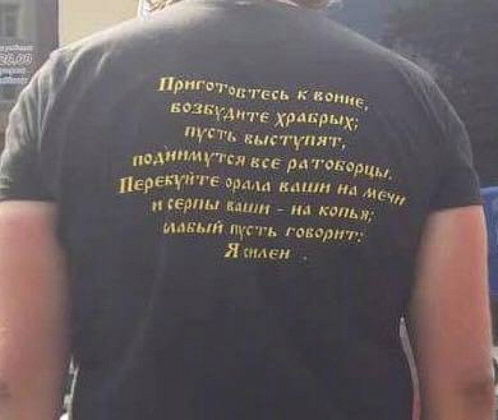 «Приготовьтесь к войне… Только что прислали сегодняшние фото из Почаева. Пишут про десятки мужчин в одинаковых футболках, надпись на которых начинается со слов «Приготовьтесь к войне…» (это слова из книги пророка Иолия 3: 9-10). Пришли с крестного хода из Каменца-Подольского. «Русская православная армия»? Славянск-2?», – написал архиепископ.