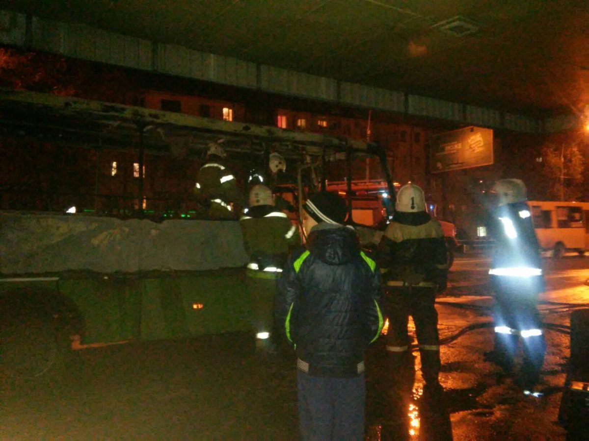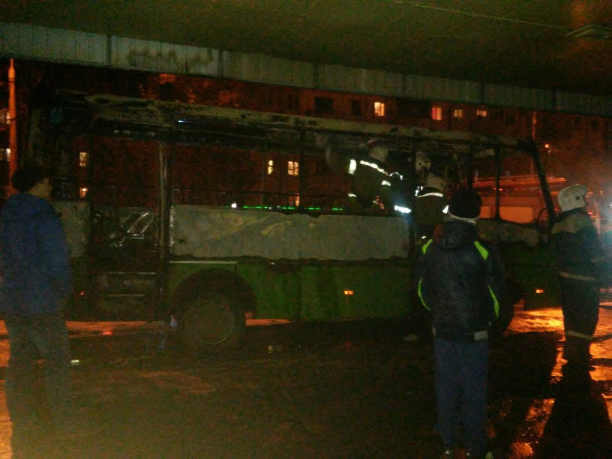 Чтобы потушить горящий автобус, приехали две пожарные машины. Салон транспорта выгорел дотла.