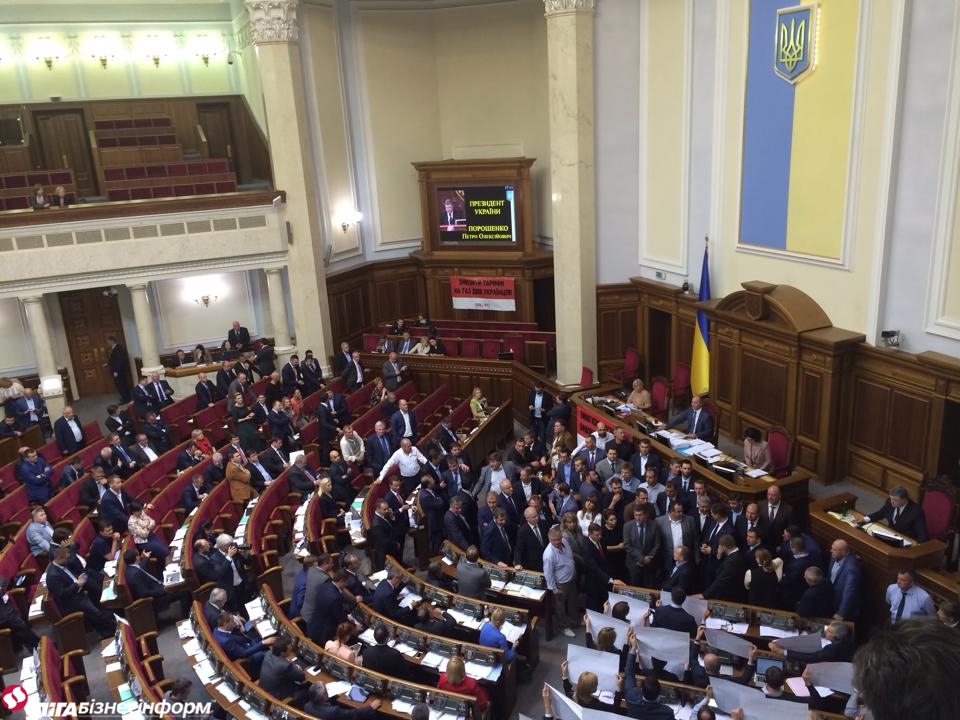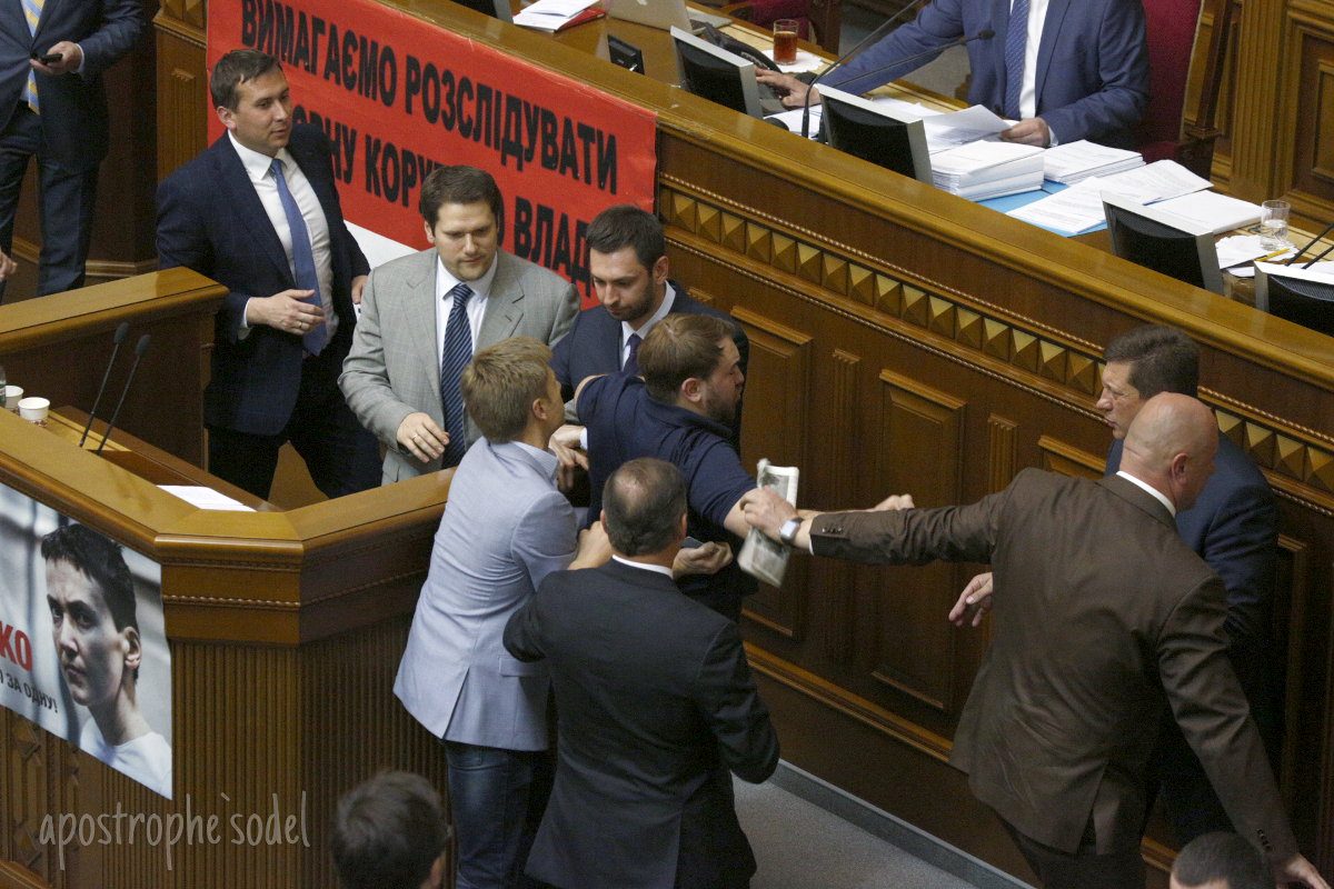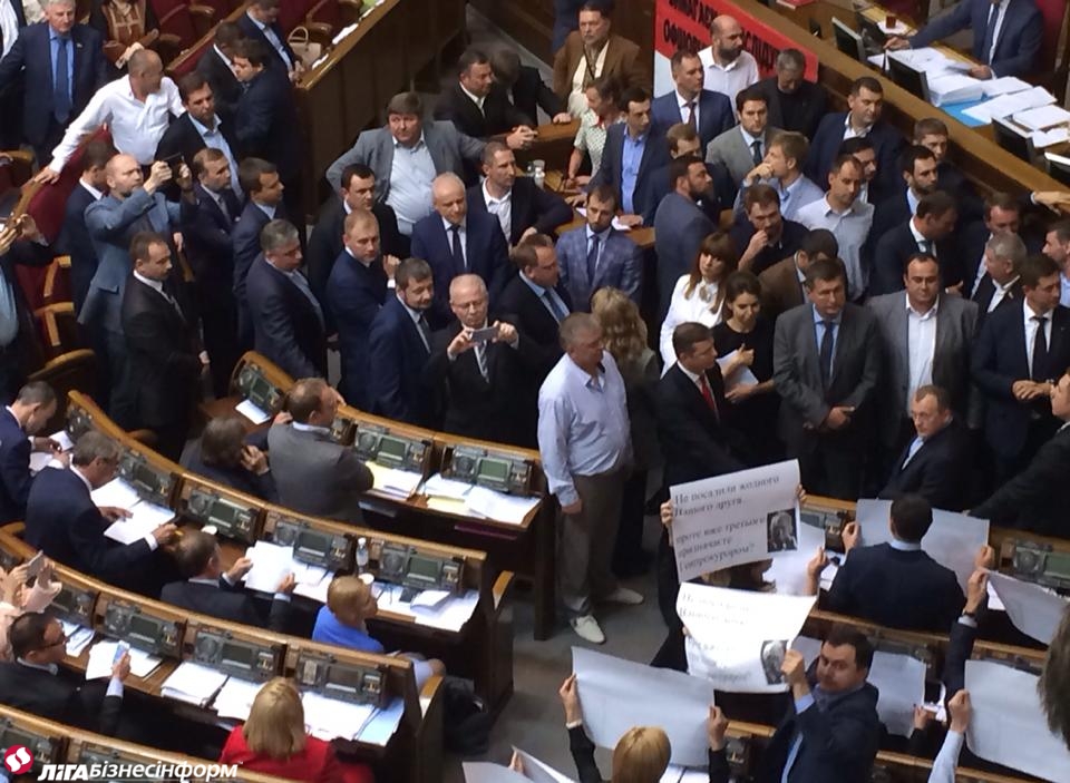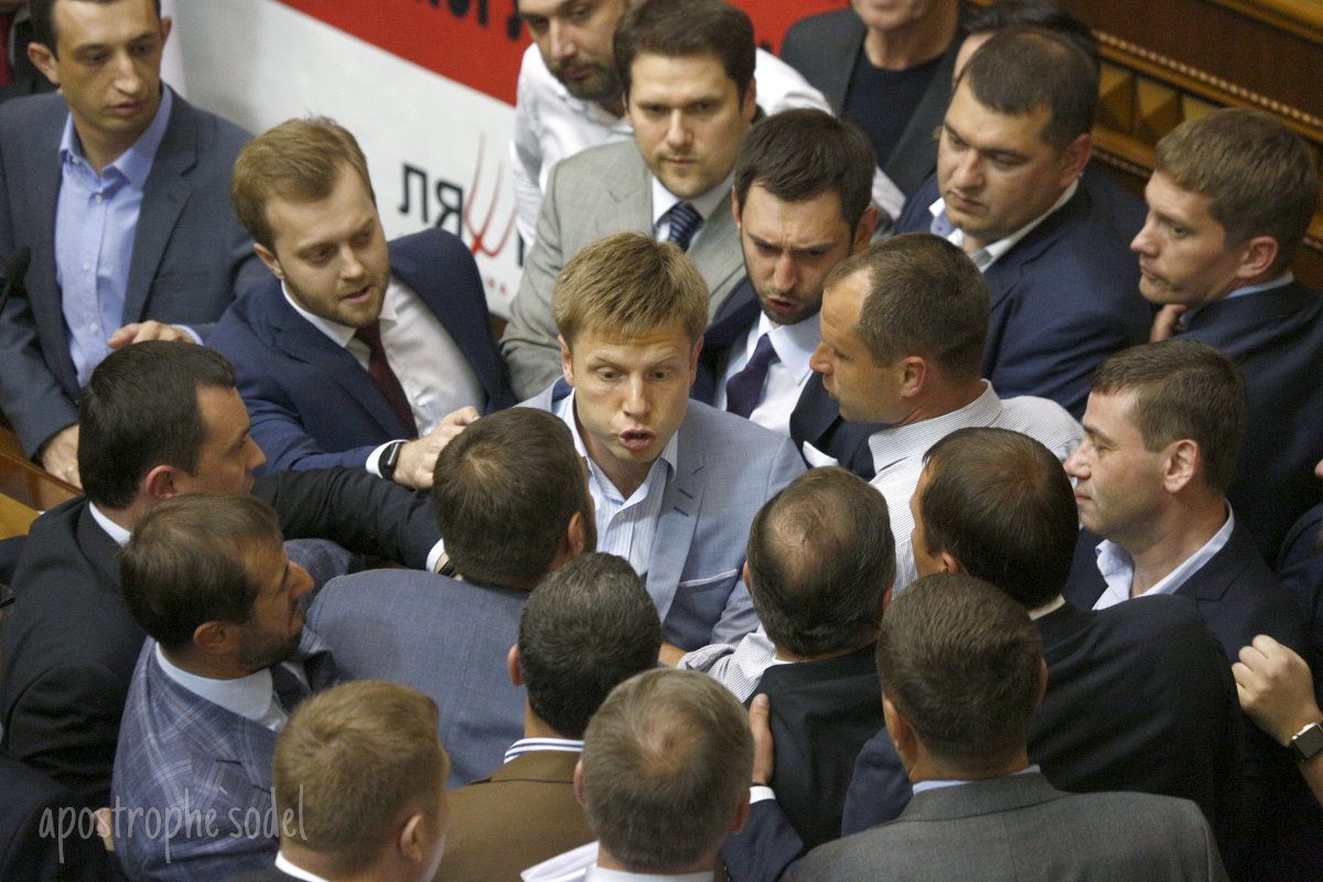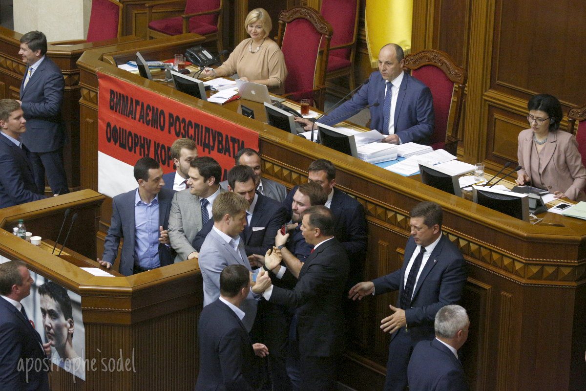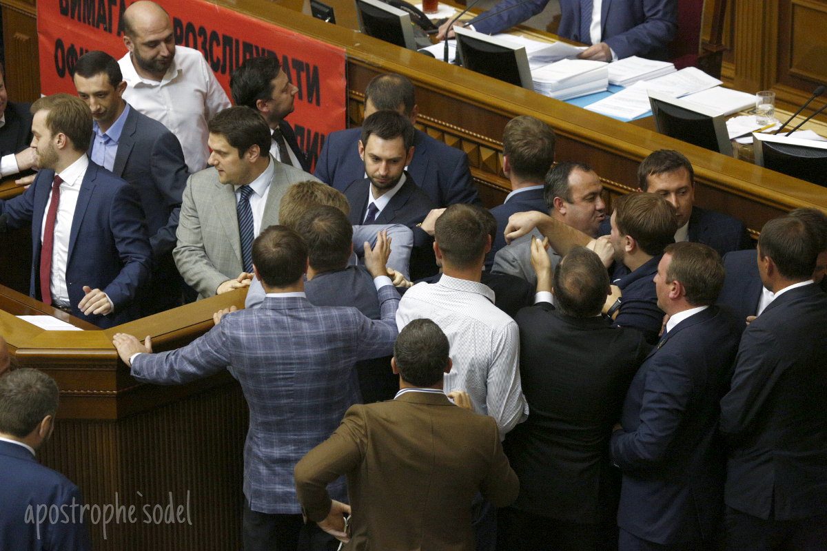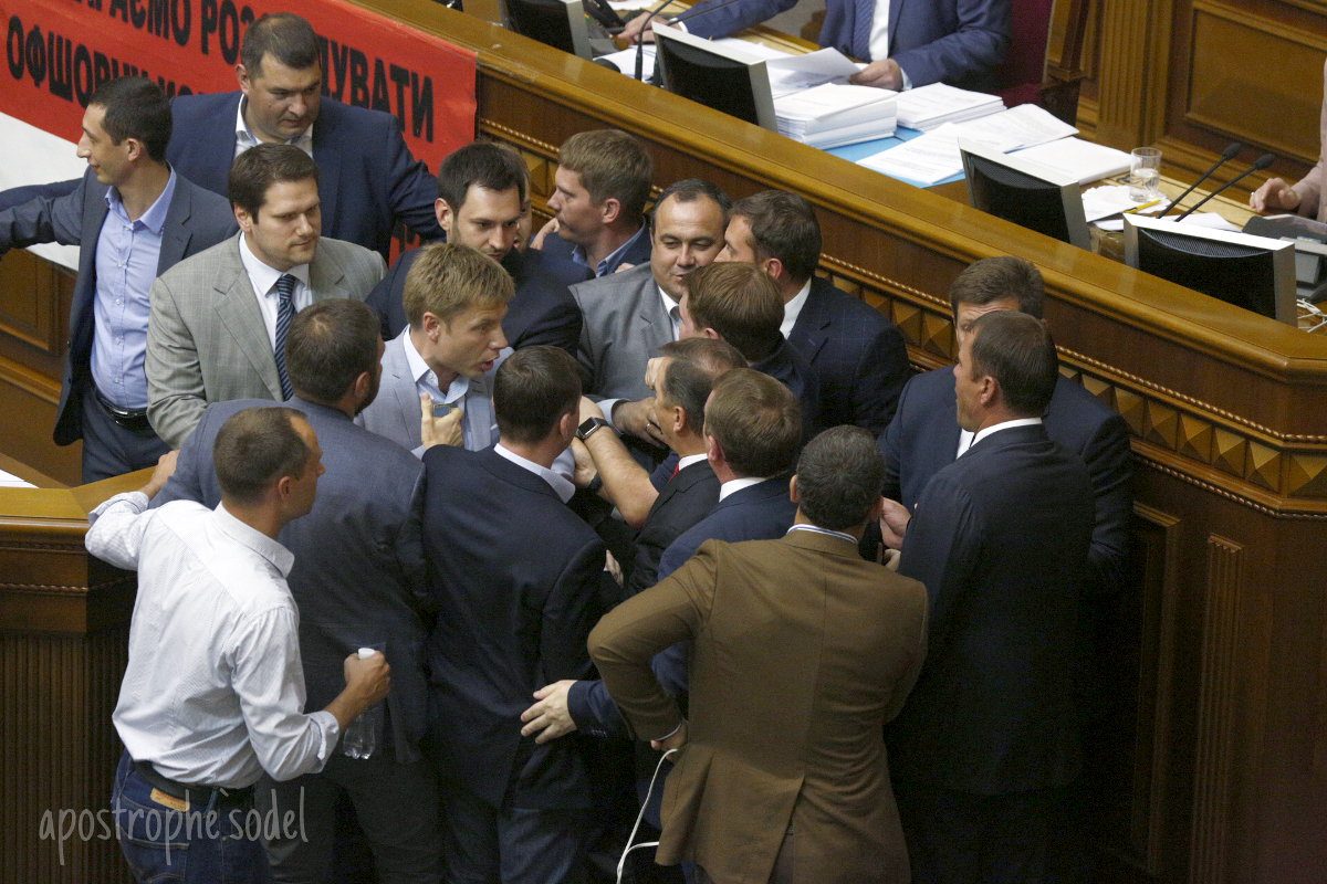 Для голосования за закон №4288 депутаты от БПП вернулись на свои места. Сразу же после голосования депутаты от РПЛ бросились к трибуне, где и возникла потасовка с депутатами от БПП, которые после голосования также вернулись к трибуне.