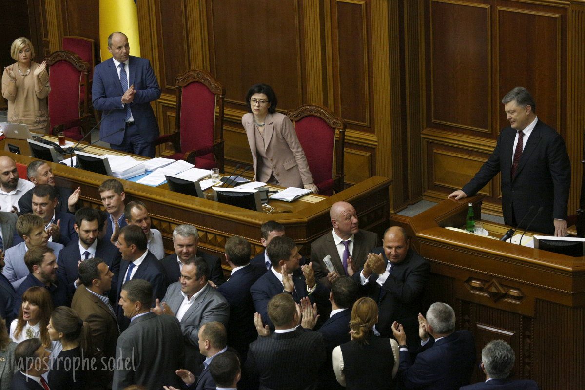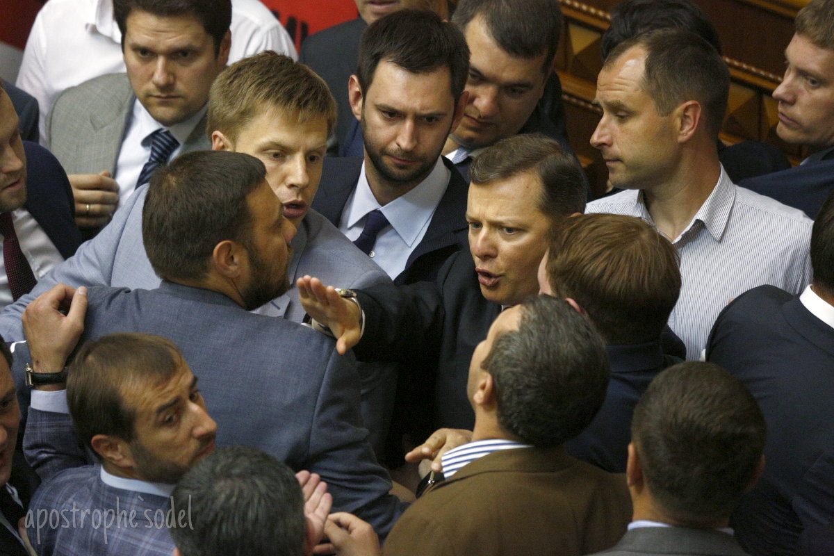 После обеденного перерыва трибуну обступили депутаты от БПП, чтобы не допустить к ней представителей Радикальной партии Олега Ляшко, которые уже два дня блокируют трибуну.