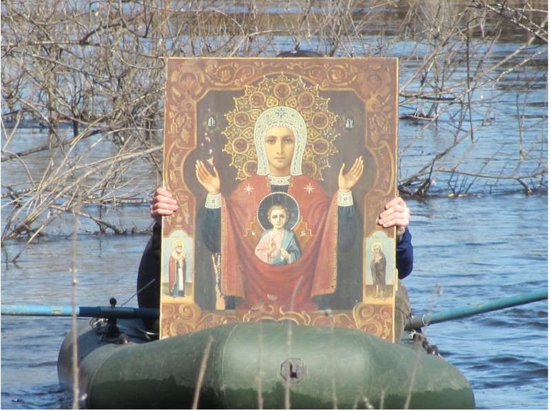«Крестный ход разделился на две части. Настоятель прихода батюшка Сергий и еще несколько прихожан двигались по реке на лодках с чудотворной иконой Божией Матери – Абалацкой (Знамение). Другая часть крестного хода с песнопениями и молитвами Божией Матери и святым Угодникам Божиим шли пешком из поселка Аёв Больши-Уковского района по реке Ильинке к местному храму», — сообщается на сайте Тарской епархии.