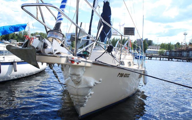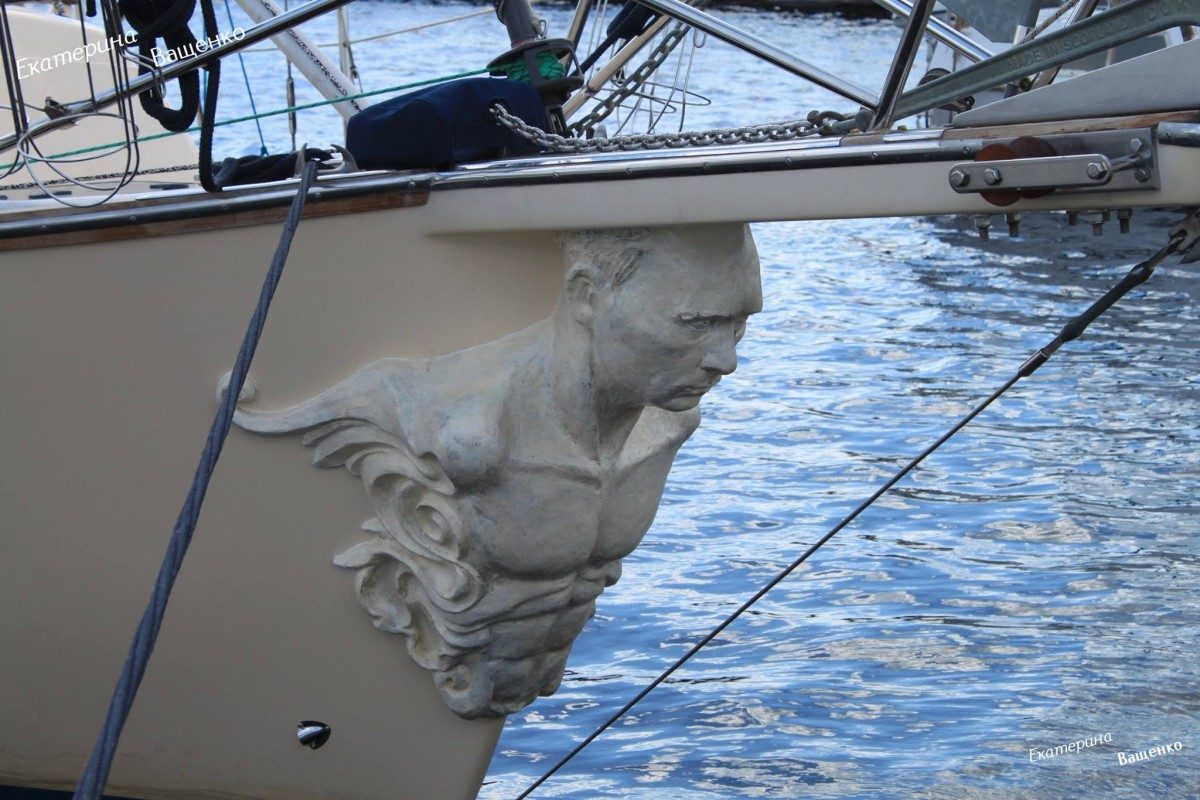 Судно удивило тем, что на носу размещен обнаженный торс президента России Владимира Путина в качестве гальюнной фигуры.