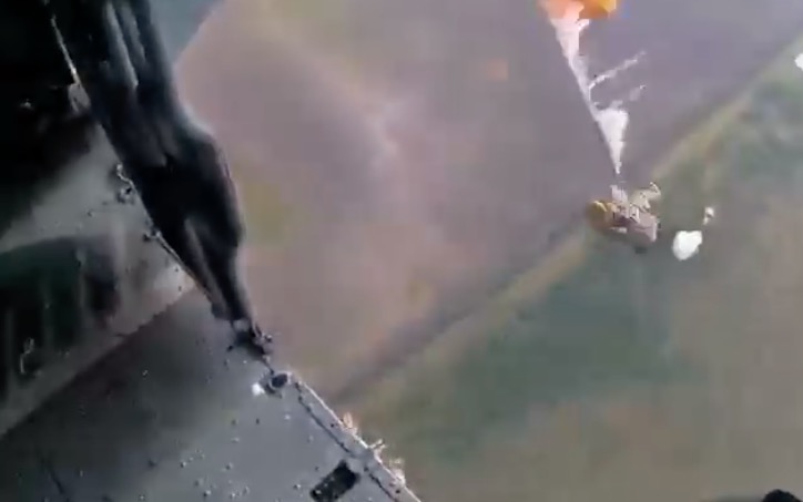 Военнослужащий российской армии совершали прыжки с вертолета Ми-8 на высоте 600 метров. Несколько солдат прыгнули успешно — у всех раскрылись парашюты. Но во время прыжка у одного из военных карабин не зацепился за трос. Поэтому не сработала система раскрытия парашютов.