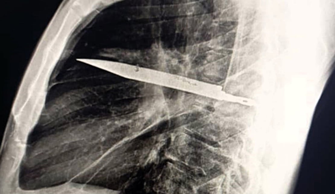 Рентген грудной клетки выявил истинную причину необычных симптомов — внутри застряло большое лезвие ножа. Оно проникло через правую лопатку, чудом не задев ни один из жизненно важных органов.