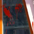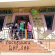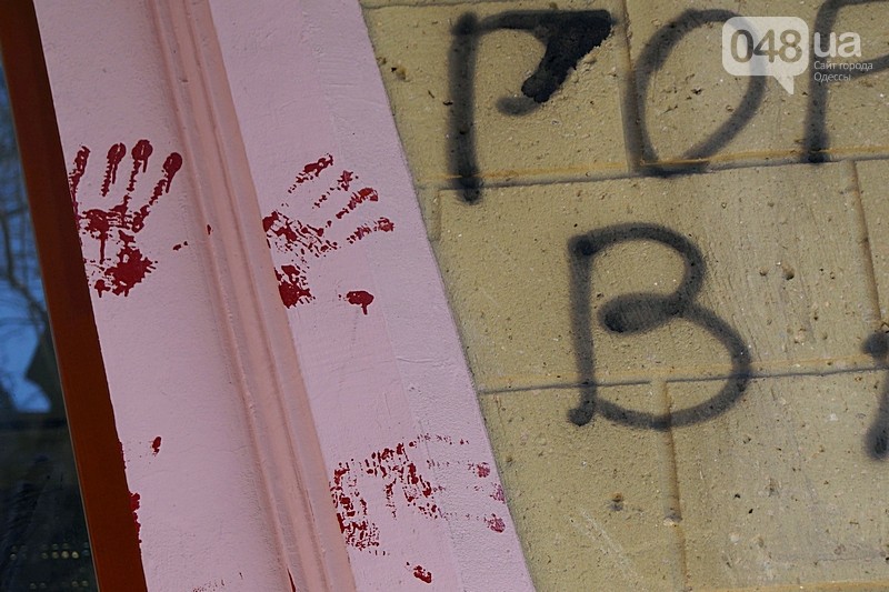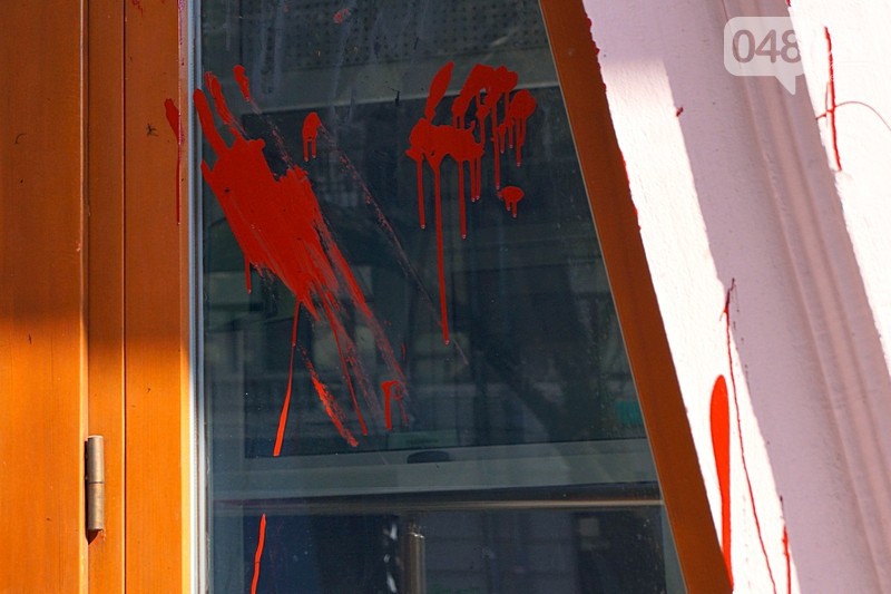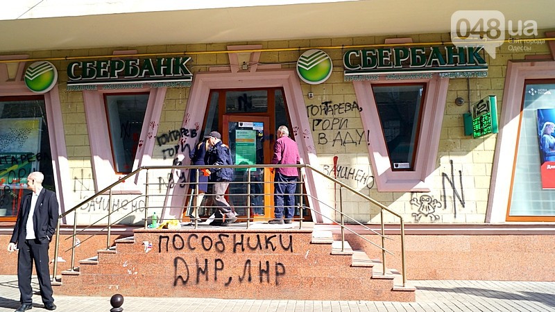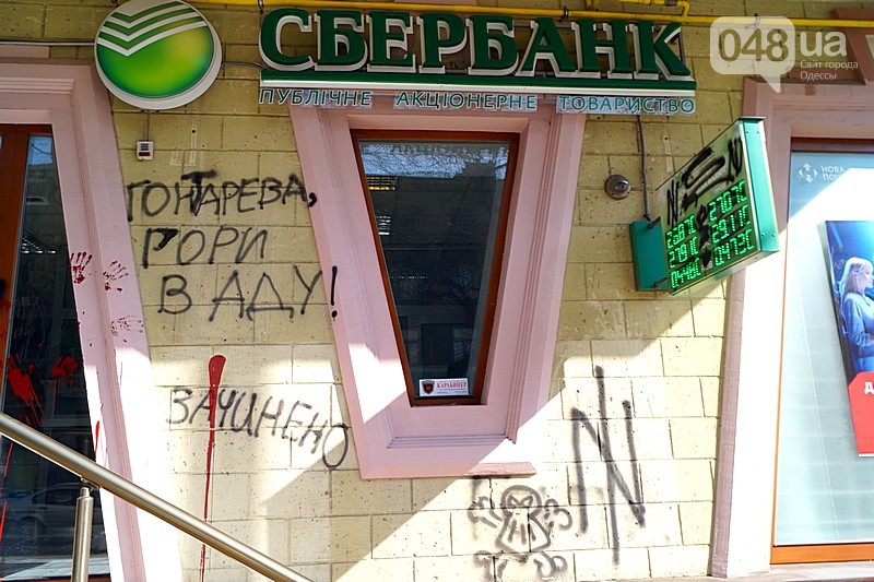 Фасад банковского здания облили красной краской и обрисовали фразами: «Зачинено», «Пособники ДНР, ЛНР». На данный момент о подозреваемых ничего неизвестно.