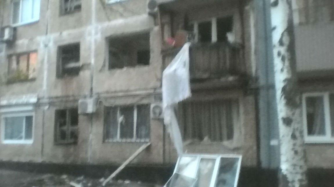 Дом находится рядом с больницей на улице Красноармейской, 84. Взрывная волна частично разрушила строение, во многих квартирах разбиты окна. На улице и в подъезде образовались завалы.