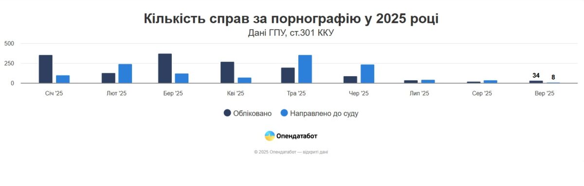 За девять месяцев 2025 года правоохранители открыли 1498 уголовных дел за изготовление, сбыт и распространение порнографических материалов. Об этом свидетельствуют данные Опендатабот.