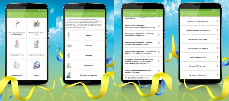 Приложение предлагает определенный алгоритм действий, который следует применять при первой психологической помощи, и позволяет пользователю сохранить информацию о том, кто пострадал.