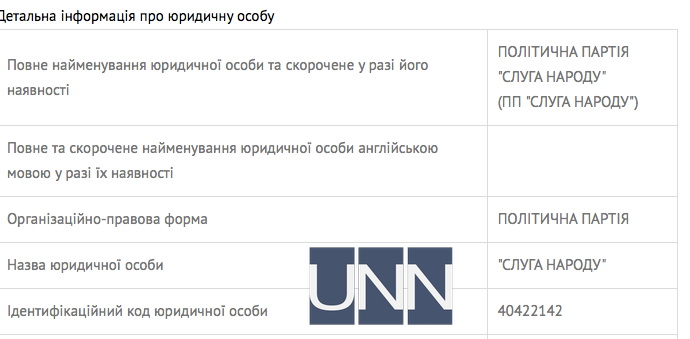 Согласно данным реестра, организационно-правовая форма юридического лица „Слуга народа“ — политическая партия.