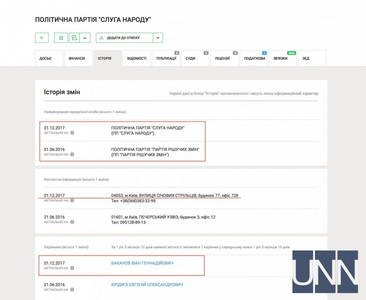 В то же время, согласно системе YouControl, ранее „Политическая Партия „Слуга народа““ называлась „Политическая Партия «Партия Решительных перемен”“.