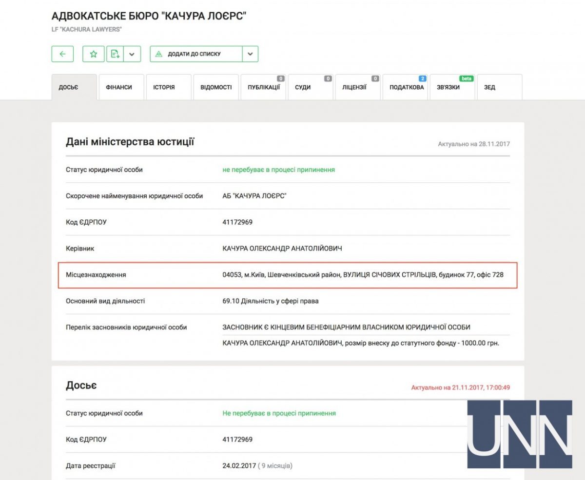 В то же время, как отмечается на сайте аналитической системы YouControl, такой же адрес указан как место регистрации частного юридического бюро “Качура Лоерс”.