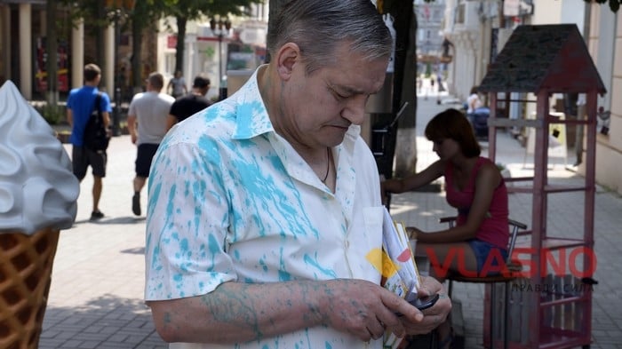 В ходе конфликта неизвестные начали обливать участников собрания зеленкой. Конфликт продолжился и на улице. В итоге активисты прогнали участников собрания «Украинского выбора».»Вы хотя бы знаете, почему собрались здесь? Вы выступаете за федерализацию Украины и дружбу с Россией, с врагом, который сейчас убивает наших парней на востоке Украины», — обратился к пенсионерам Александр Яремчук.