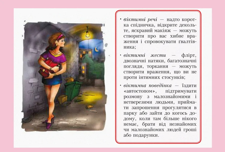 Авторы учебника советуют детям не ходить по вечерам в одиночестве, особенно в откровенной одежде. Кроме того, школьников просят воздерживаться от того, что может быть воспринято как их легкодоступность и готовность к сексуальным отношениям.