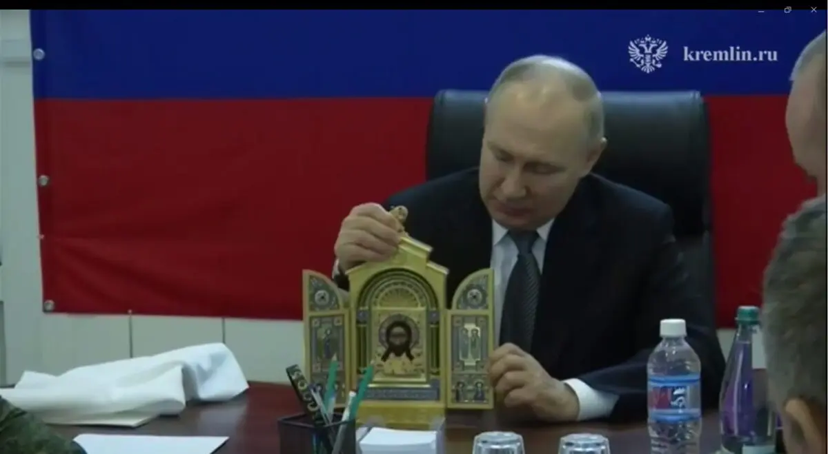 После этого следуют кадры из комнаты с кафельными стенами, где Путин вручил военным копию иконы, которая принадлежала «одному из наиболее успешных министров обороны российской армии в XIX веке». В ходе вручения иконы Путин сказал: «Сейчас вот Пасха будет, да?».