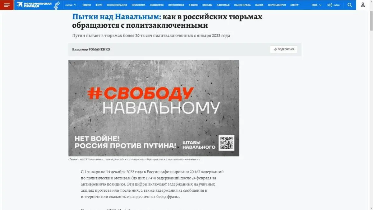 «Взлом «Комсомольской правды» от наших сторонников! Они разместили на сайте «любимой газеты Путина» публикации о пытках над Алексеем Навальным и войне в Украине. Сейчас сайт вернули в прежнее состояние, но, как он выглядел, можно посмотреть на сервисе «Вебархив»», — отмечает канал.