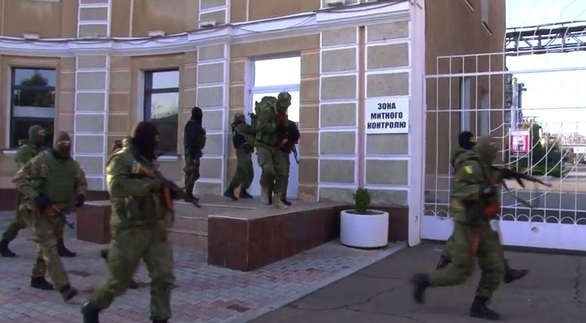 На записи видно, как несколько парней в спортивной форме битами начали разбивать стекла проходной НПЗ, вскоре к ним присоединились два десятка людей с закрытыми лицами, в камуфляже и с автоматами, а также гражданский в деловом костюме с бумагами.