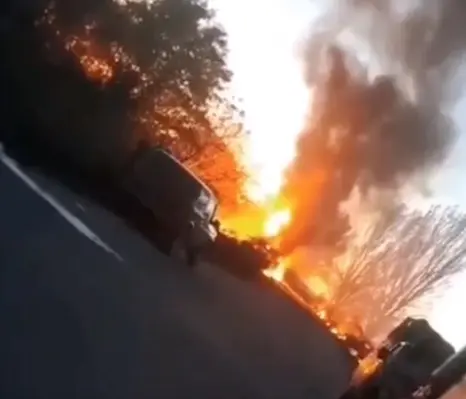 На видео с места удара видно множество горящих машин. Была уничтожена целая колонна.