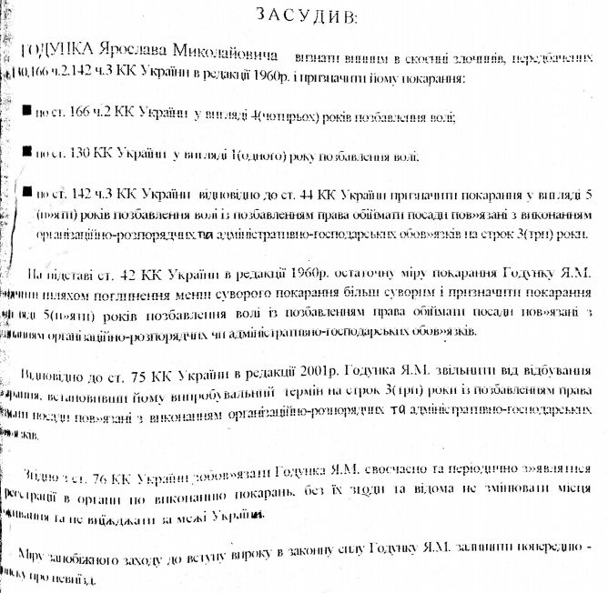 Обновление: Как пишет УП, Святошинский райсуд Киева решением от 16 мая 2002 года осудил Ярослава Годунка к 5 годам, поскольку тот как водитель машины «Беркута» (МВД) участвовал в квартирных кражах, – но освободил от отбывания наказания, установив испытательный срок на 3 года с учетом раскаяния и возмещения вреда.