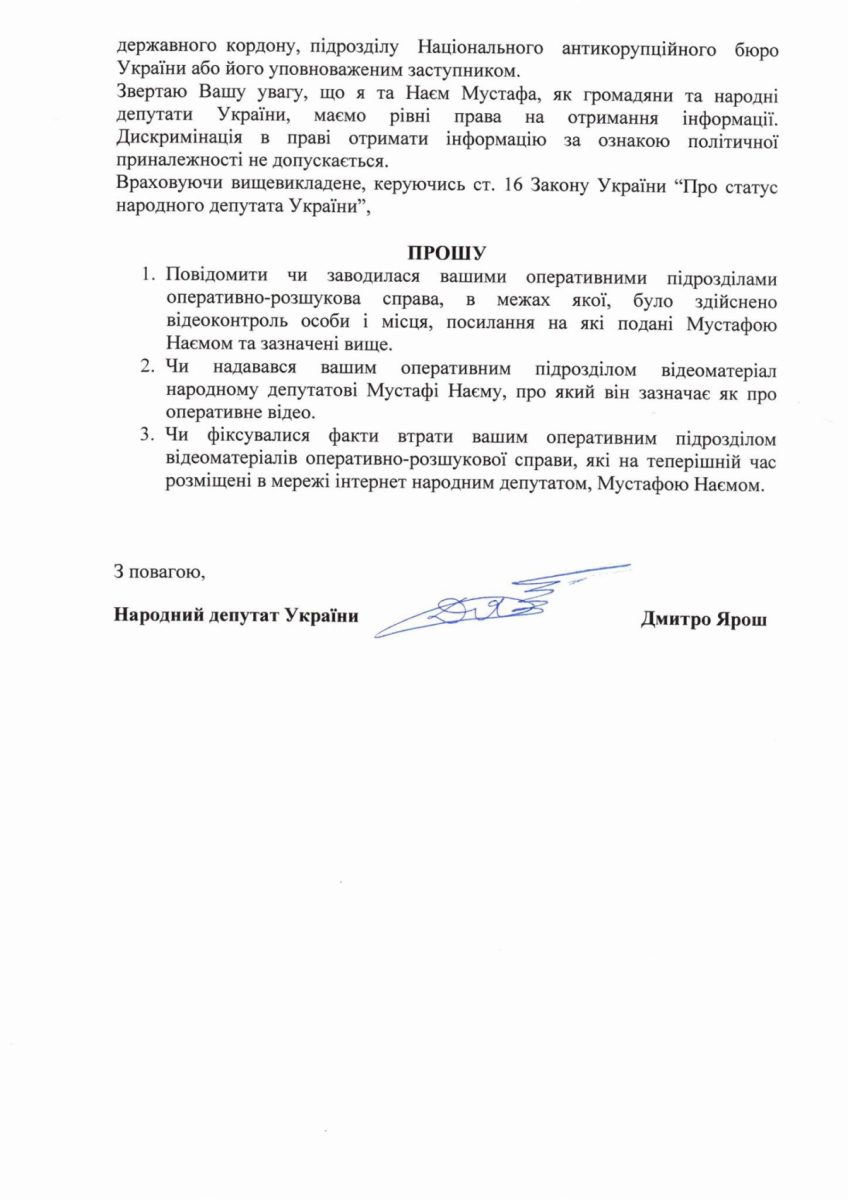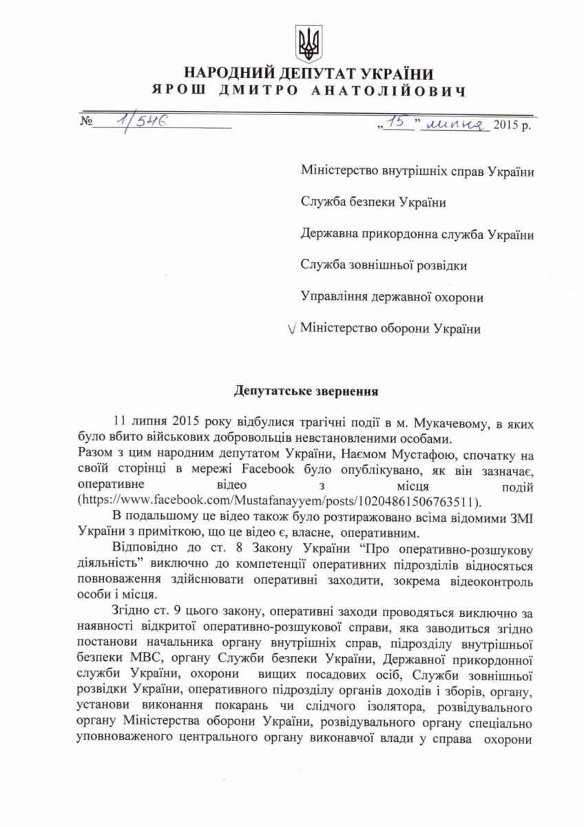 Лидер военно-политической организации «Правый сектор» Дмитрий Ярош обратился в МВД и СБУ с просьбой разобраться, откуда народный депутат Мустафа Найем получил оперативное видео событий в Мукачево.