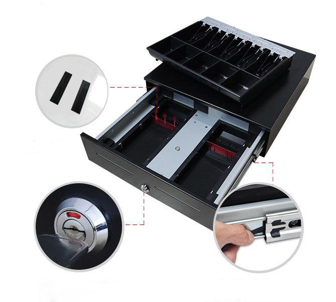 - Замок. Оптимальное решение — электромеханическая система, которая открывается как при помощи обычного ключа, так и при помощи кода, который задается кассиром через терминал. Хорошо, если у системы есть функция для блокировки, а также возможность открыть крышку без ключа в аварийных случаях. Самые простые механические замки — это выбор для работы с небольшими суммами.