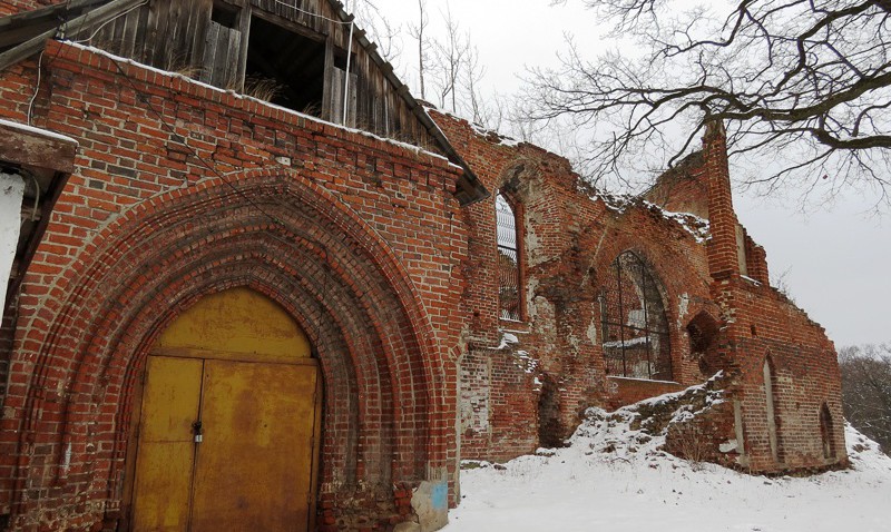 Кирху построили тевтоны в 14 веке. При русских первое время (до 1957 г.) она служила Домом культуры. Потом прогнили стропила на крыше. Здание забросили. В 1988 г. крыша (показана стрелкой) рухнула: