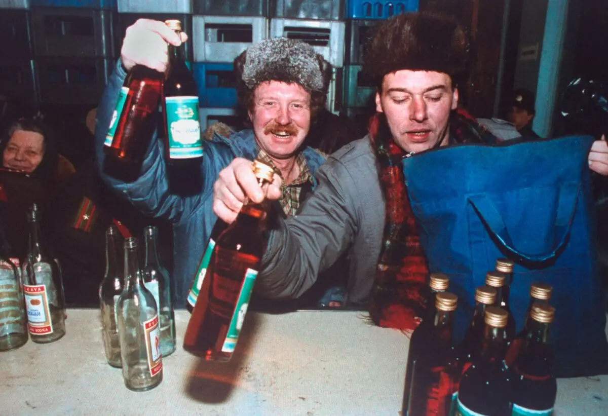 19. Тоже вино-водочный отдел, счастливый обладатель водки «Пшеничная», купленной по талону — дядька демонстрирует фотографу также и сами талоны с одним отрезанным и отоваренным квадратиком.