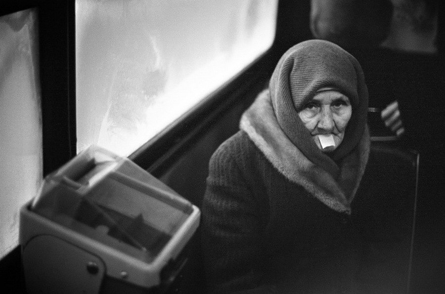 Бабушка с талончиком в зубах в одном из городских трамваев. Как там пелось в совковой песне — «…старикам везде у нас почёт». На Загнивающем Западе ровесницы этой бабушки имели собственный дом, несколько автомобилей и путешествовали по миру, а в совке старость выглядела вот так.