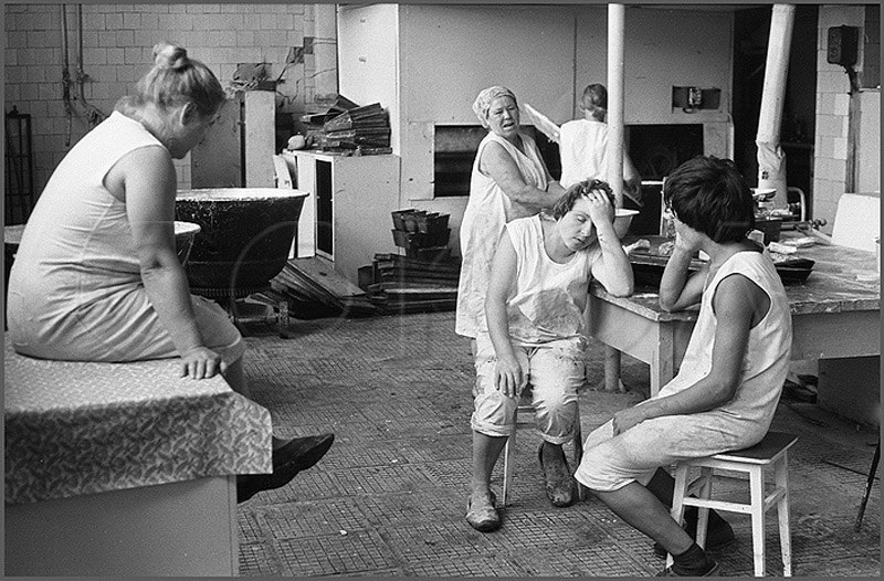 Немножко всякой «производственной» жести. На снимке — отдых работников хлебопекарни. В хлебопекарне установлена автоматическая линия, но хлеб в ней получается плохой, непышный. Поэтому в основное время пекари фасуют тесто по формам руками, а линию включают только на время приезда проверок. Совок как он есть.