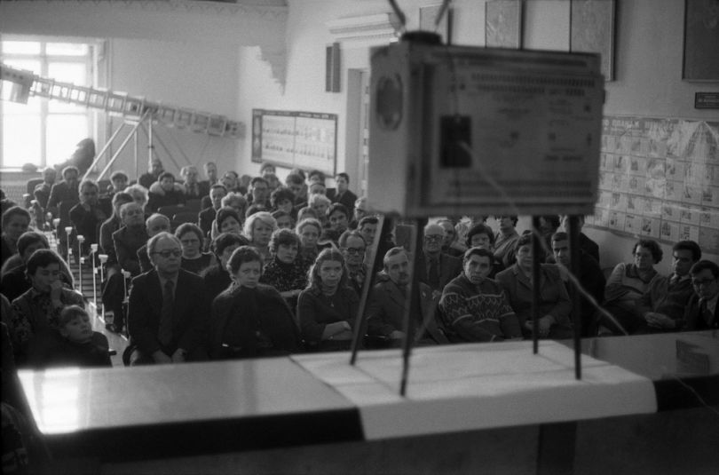 Похороны Андропова, актовый зал одного из производственных предприятий. Людей реально сгоняли в актовые залы и заставляли смотреть на похороны «вождей».