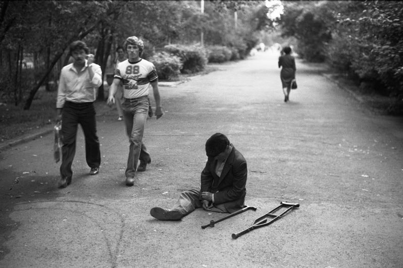 Проспект Энтузиастов в городе Новокузнецке, снимок 1983 года. В центре кадра сидит всеми брошенный безногий инвалид…