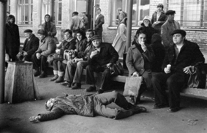 Ещё из той же серии — на трамвайной остановке валяется бесчувственный алкаш, вокруг бедно одетые люди едят лучшее в мире советское мороженое и даже не смотрят на бесчувственное тело у ног — словно это нормальная часть пейзажа. Откуда взялся миф о какой-то там «особой душевности» советских людей, кто его придумал?