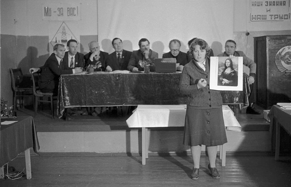 Какое-то кафкианское совковое собрание с бредовыми надписями сзади, написанными на языке Андрея Платонова — «Мы — за вас!», «Наши знания и наш труд!», не хватет только лозунга «Все братья — сёстры!».
