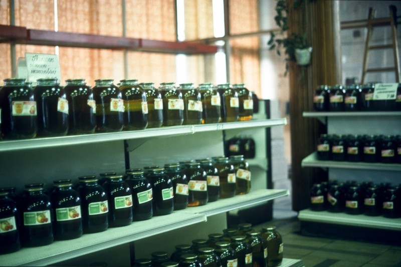 Итак, начнём. Фанаты совка часто не верят тому факту, что в позднем СССР на прилавках не было практически ничего, кроме баллонов с соком, а вот на фото ниже прямое доказательство этого факта — снимок сделан в одном из советских гастрономов в восьмидесятые годы. Качество снимка довольно хорошее, можно даже рассмотреть этикетки — на средней полке стоят банки с яблочно-вишневым соком, а на верхней — с яблочно-малиновым.