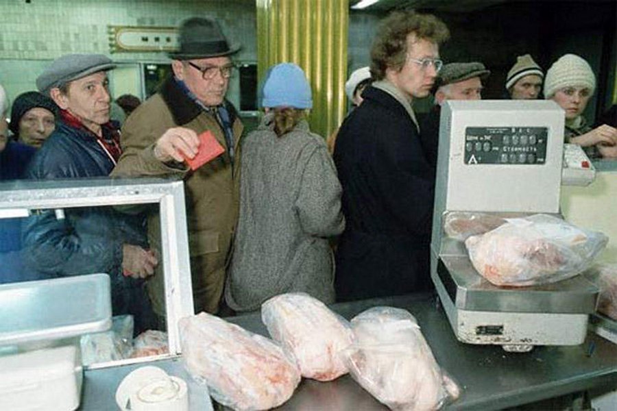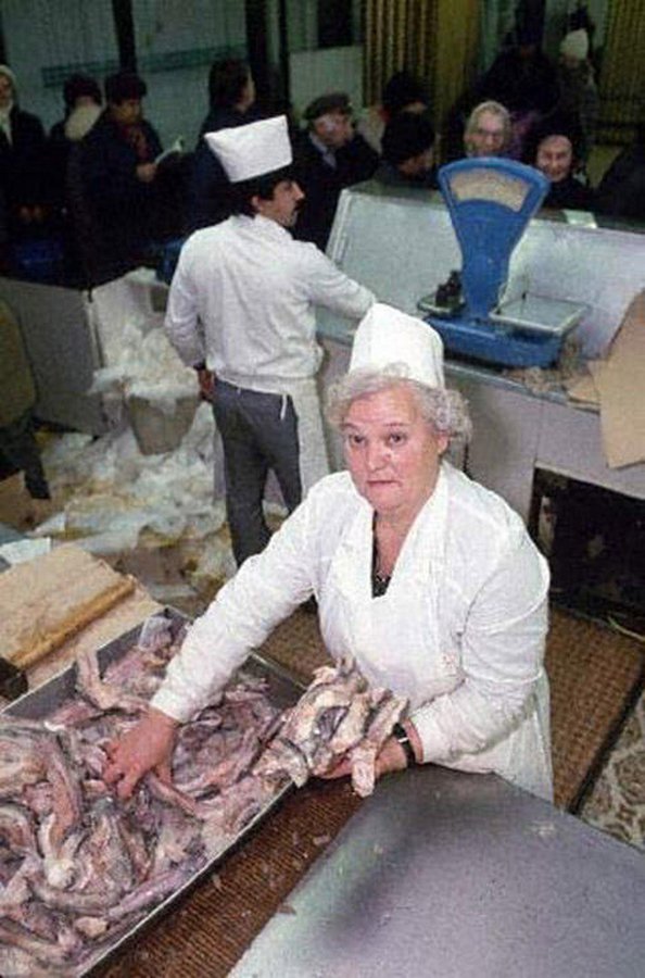 А это продажа замороженных кур — которые были в позднем СССР жутким дефицитом. Я рос в небедной семье, но куриное мясо видел не чаще 1-2 раз в месяц — их просто нельзя было нигде купить.