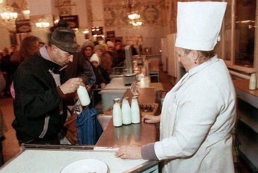 В отдельные годы в отдельных частях СССР дефицитом было даже хорошее бутилированное молоко — и оно не стояло свободно на прилавках, а отпускалось продавцами, как это можно увидеть на снимке ниже. Вообще, кстати, если в СССР что-то не стояло свободно на прилавках (как сок в баллонах на снимках выше) — то будьте уверены, это был дефицитный товар, пользующийся спросом.