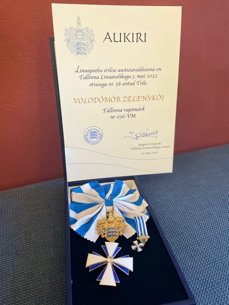 Отмечается, что «награду для Владимира Зеленского председатель городского собрания Таллинна Евгений Осиновский передал находящемуся с визитом в Эстонии первому заместителю Председателя Верховной Рады Украины Александру Корниенко».