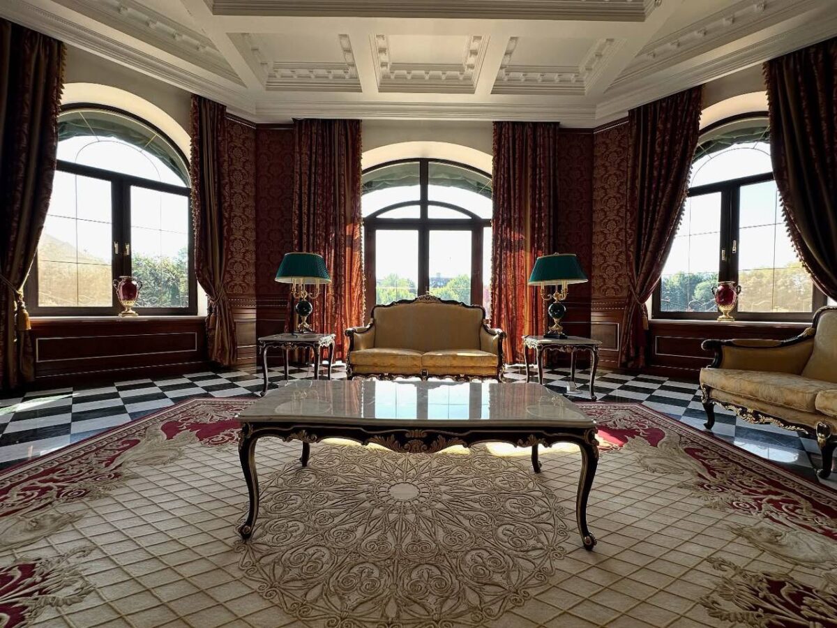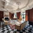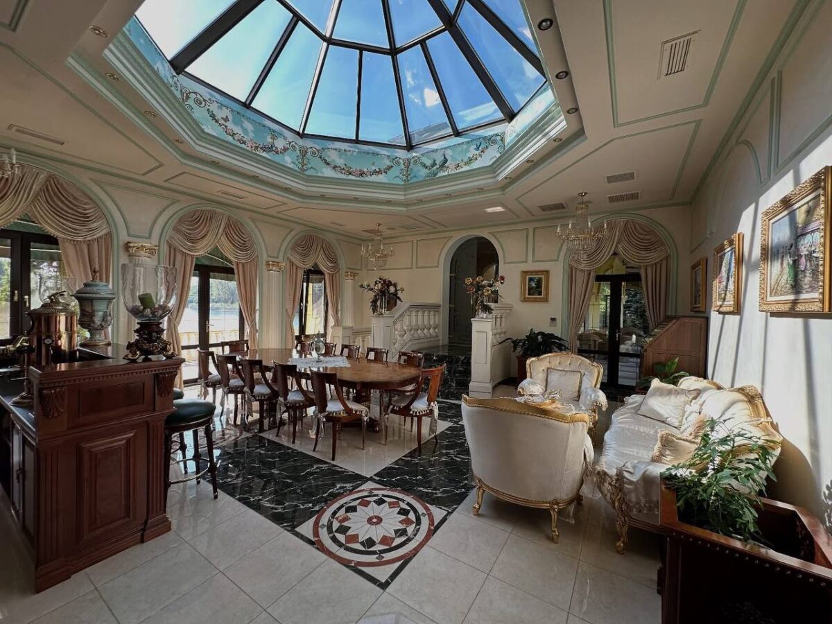 На первом этаже – гостиная с зоной столовой и выходом на террасу, кухня, гостевая спальня, кинотеатр, зимний сад, три санузла, SPA-зона с бассейном и сауной, гараж на три автомобиля, комната для персонала и подсобные помещения.
